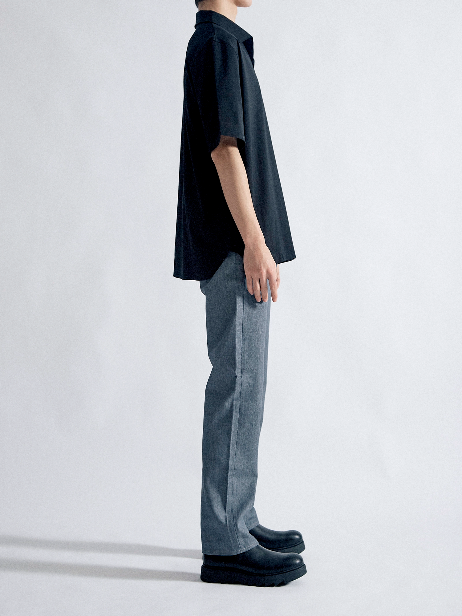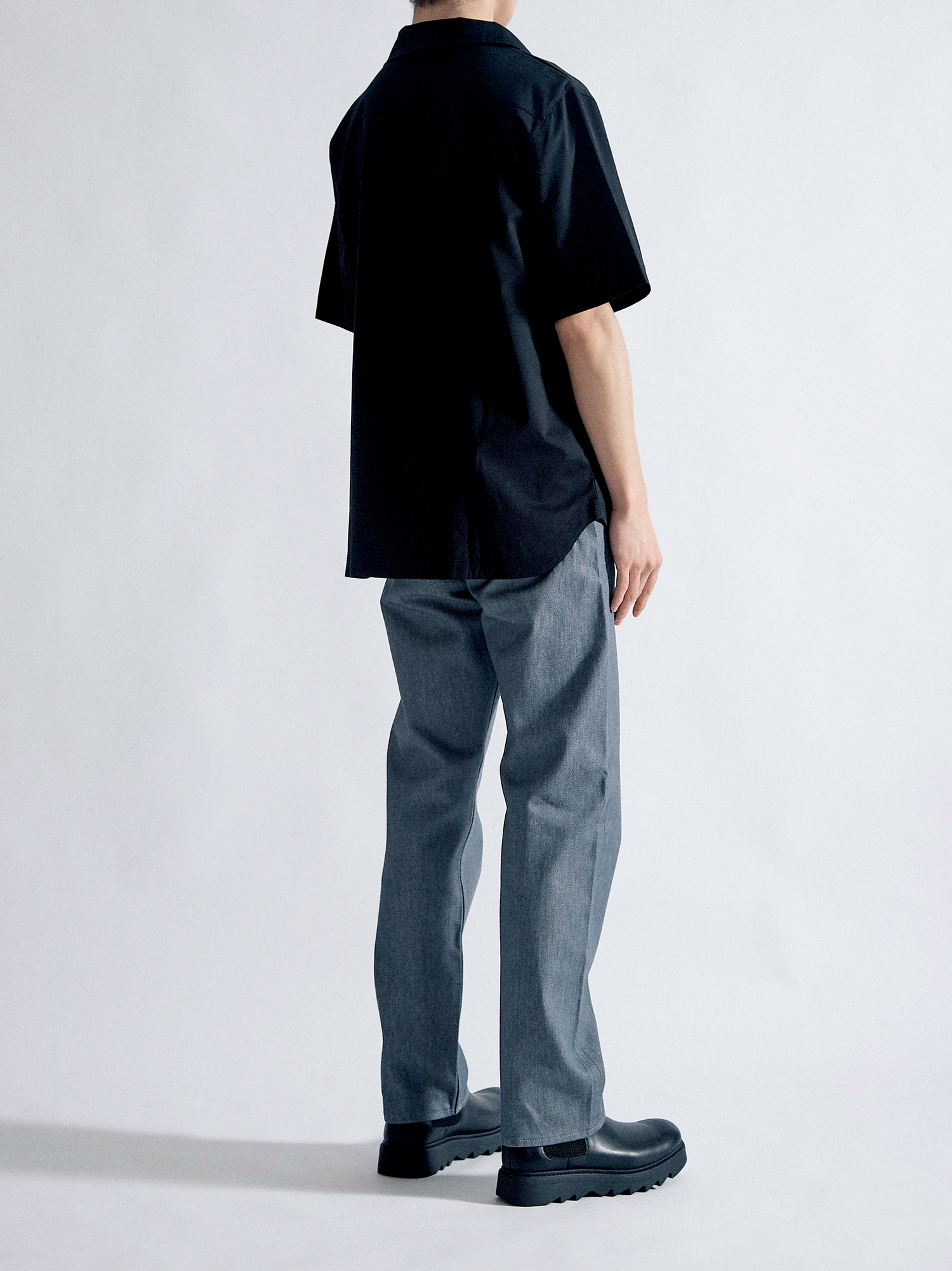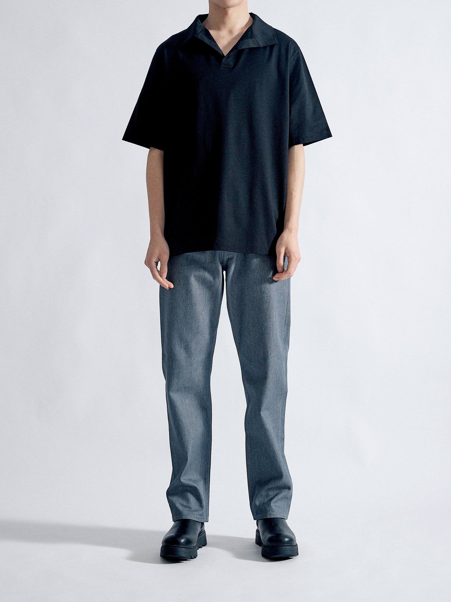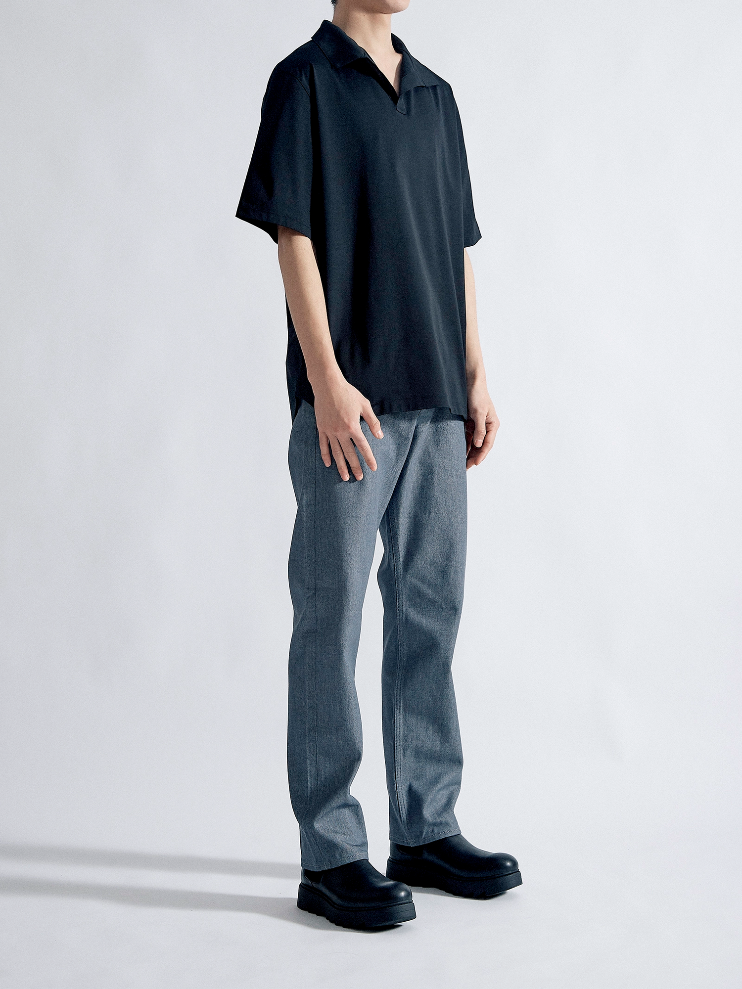 前面に爽やかな印象のオブロングカラー、背面はヨークパーツを取り入れ、一見シャツのような一枚。